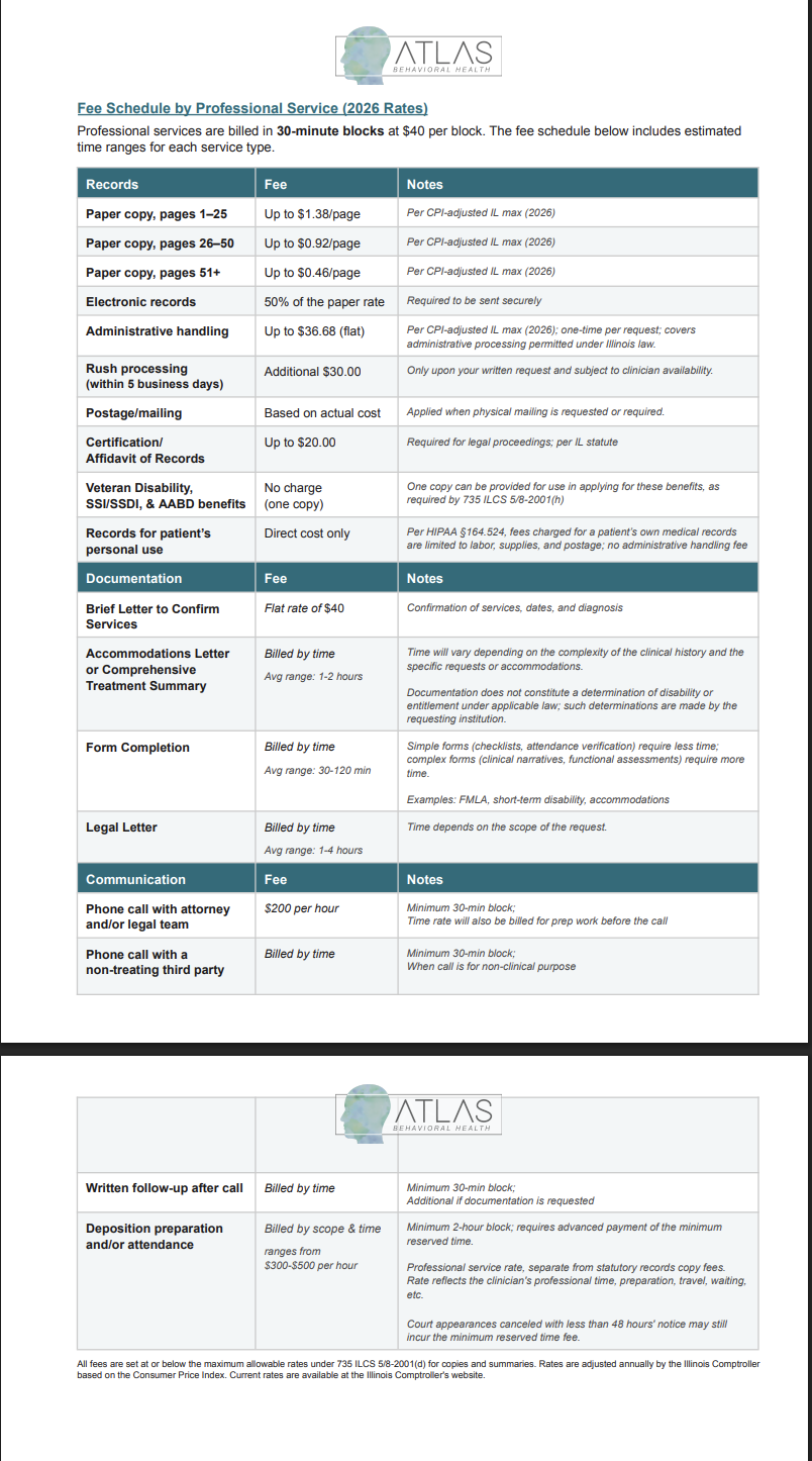 Professional Services Outside Therapy Fee Schedule